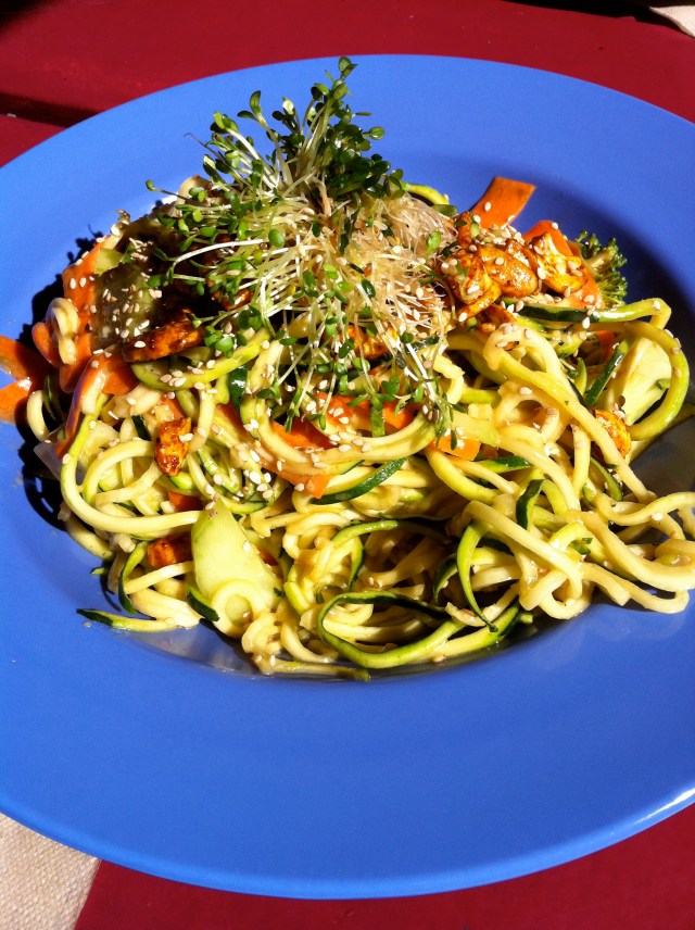 Back to my quest to try to NOURISH my family BETTER. I like to think that we have an amazing diet. But my thoughts were how to do BETTER. So I decided to take one of the days of the week, and make it a primarily RAW DAY!!! Yummy…… So Thursdays are our raw day.I have been having a lot of fun with this one. And my favorite kitchen gadget for raw Thursdays is my Spiralizer. I would like to share a salad that I had down in Key West, Florida at a wonderful whole food cafe called Help Yourself. This is my rendition. ENJOY!!!
