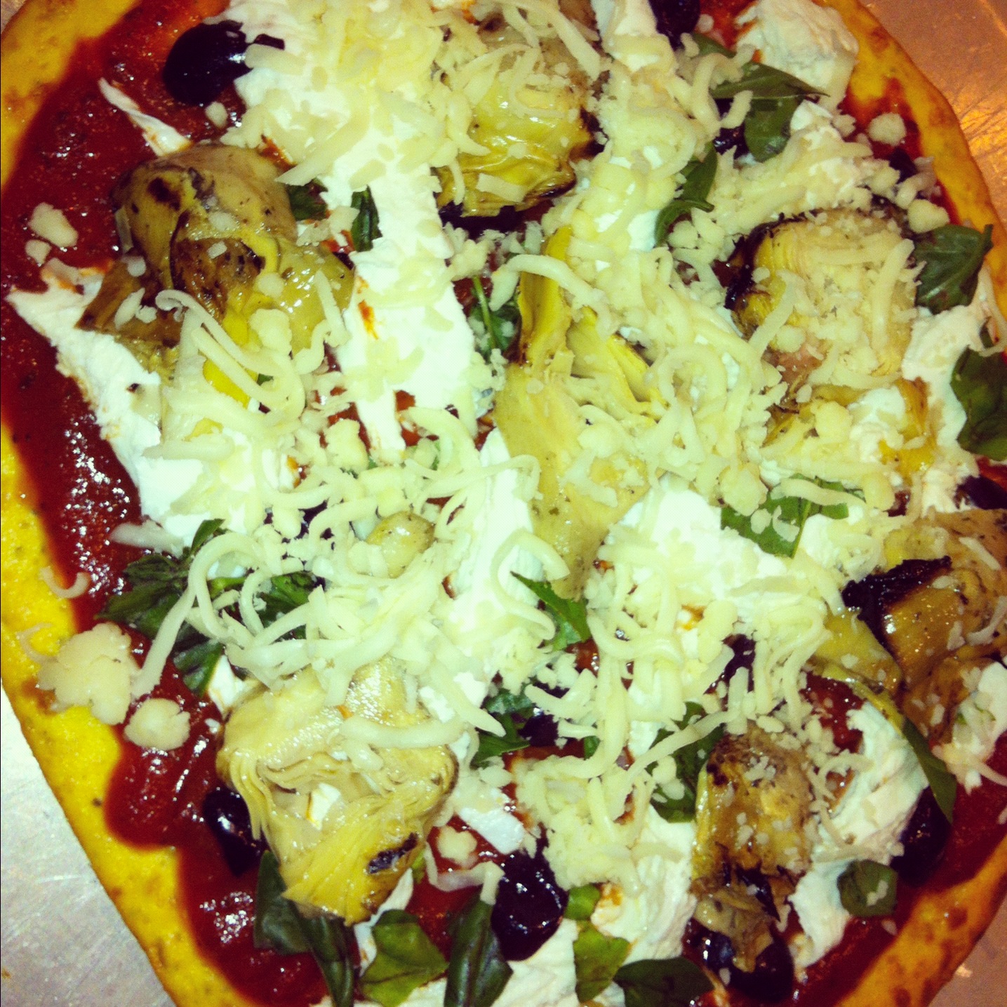 Beautiful coconut flour pizza crust with fresh mozzarella, grilled artichokes, fresh basil, olives…. and lots of love.