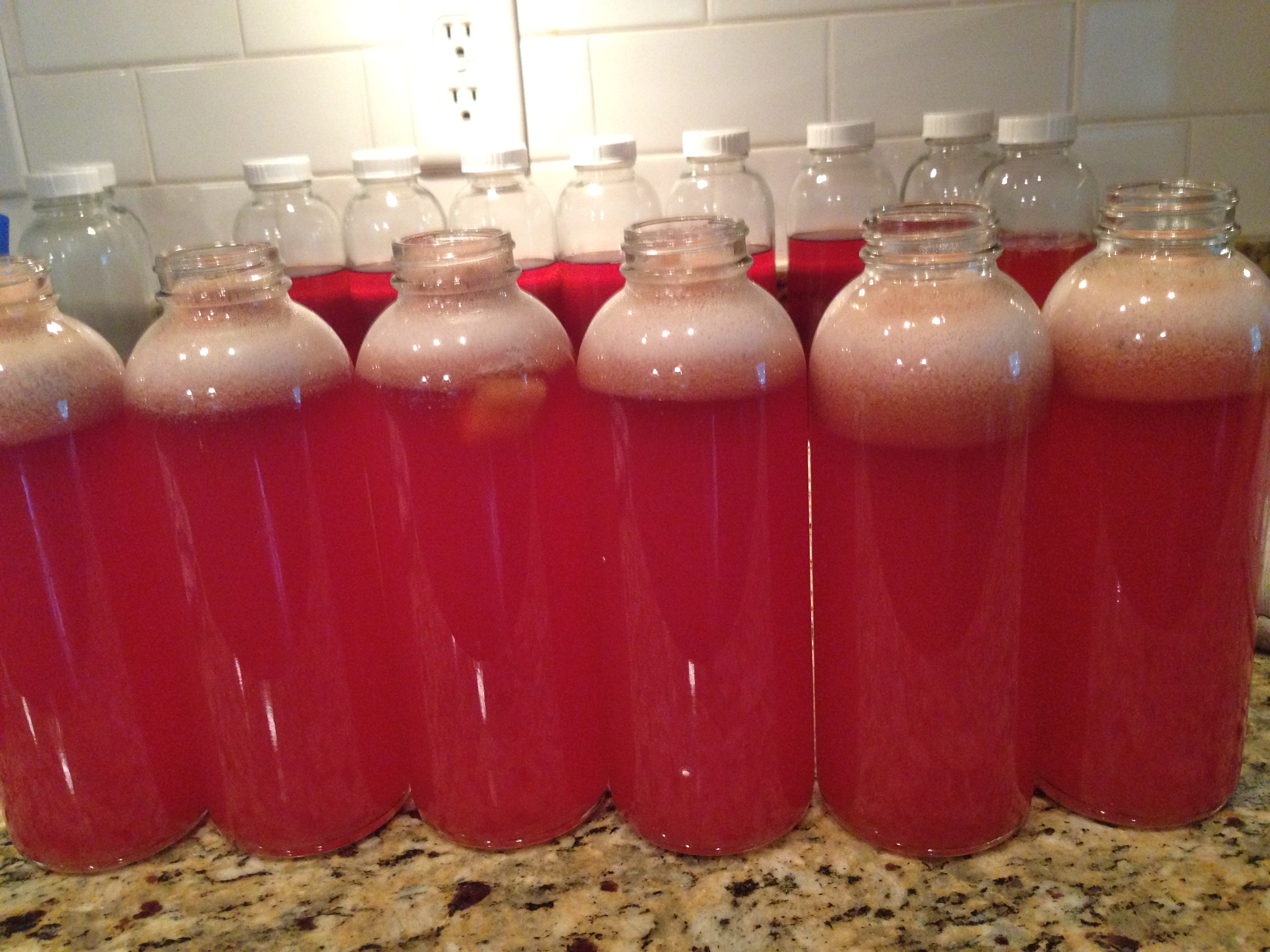 First– Brew sweet tea- Use any flavor of tea that you like. I used a combo of red rooibis and red zinger probably about 1 gallon. Then add 1/2-1 c. of organic sugar and let cool.
