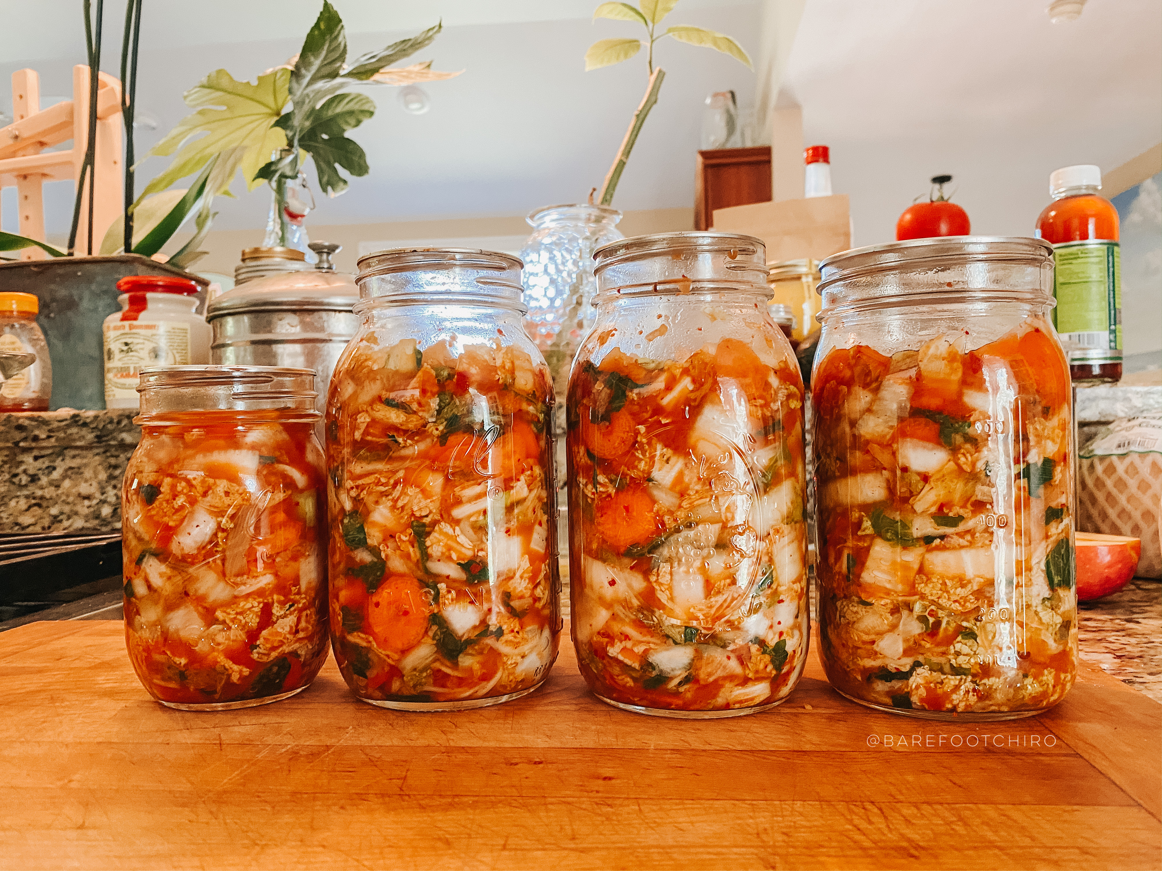 Whenever I’m finishing up a jar of kimchi I save the liquid in another jar. Sometimes I put it in the fridge & sometimes I will just set it on the counter until I’m ready to start a new batch. This method of continuing the probiotic diversity and sharing the frequency from the past is something I also do in the garden and when I make my bath salts or any body care products.